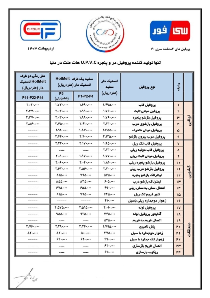 پروفیل های در و پنجره از جنس یو پی وی سی در انواع دسته بندی سفید و رنگی با نام تجاری سی فور میباشد.